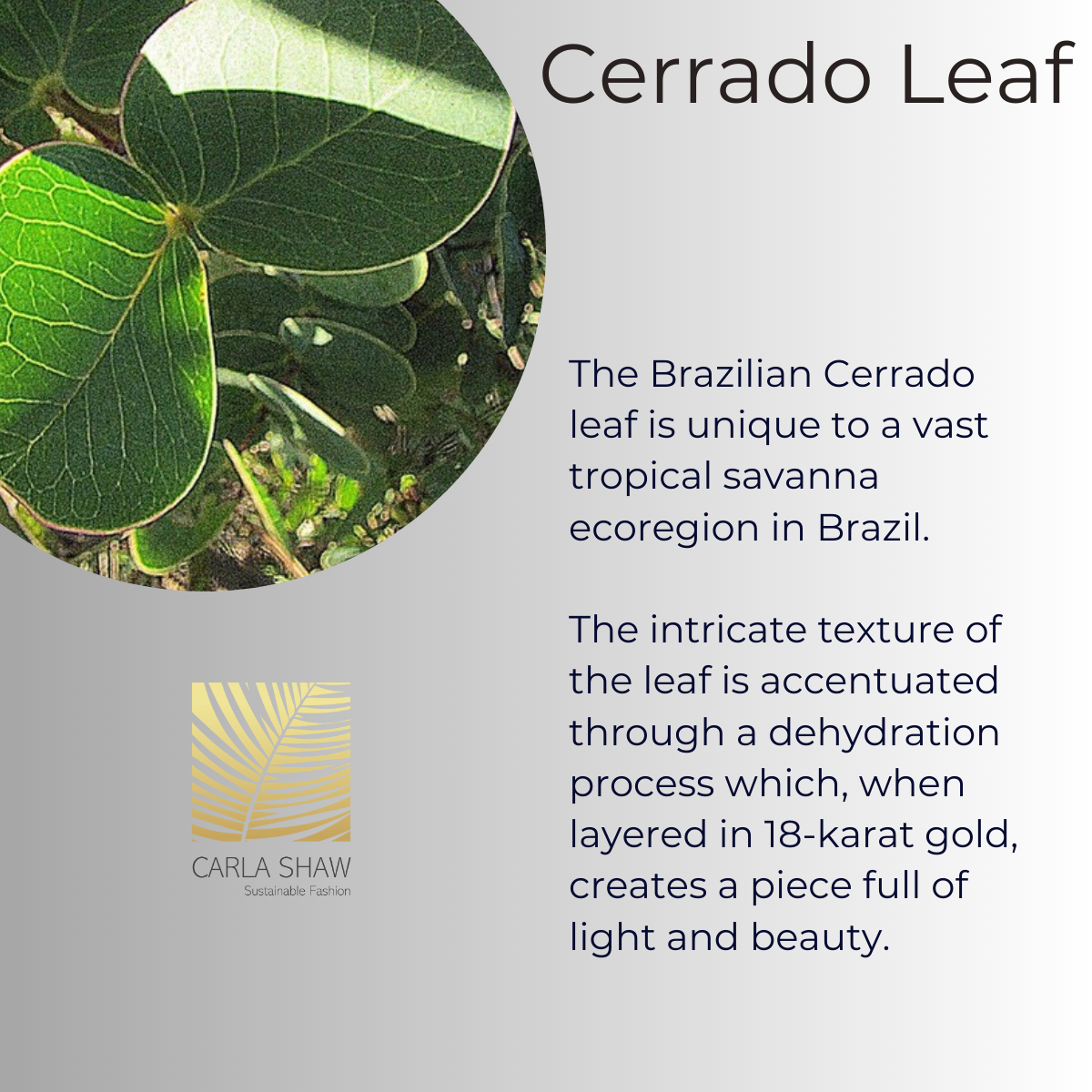 The Cerrado Bicuda leaf is unique to a vast tropical savanna ecoregion in Brazil. The intricate texture of the leaf is accentuated through a manual dehydration process which, when dipped in 18-karat gold, creates a piece full of movement, light and beauty. Being adjustable, you may place the leaves where they better compliment your outfit or occasion. This is a very versatile piece, full of charm, shine, and elegance. One of our top-sellers!